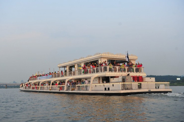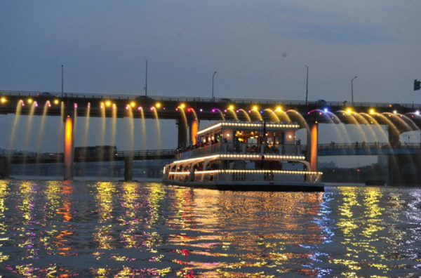 前往码头乘坐夜游汉江游览船欣赏盘浦大桥彩虹喷泉表演