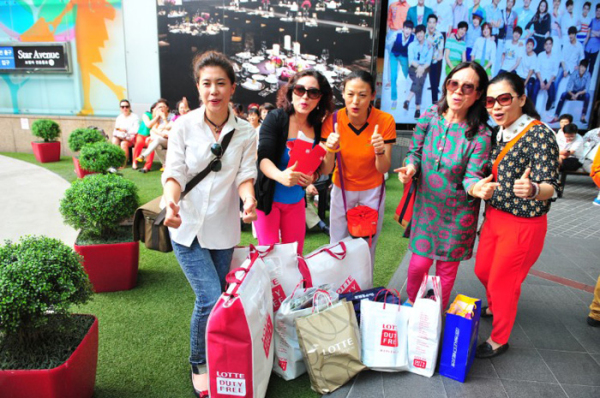 在乐天免税店畅快的购物,大家大包小包满载而归!