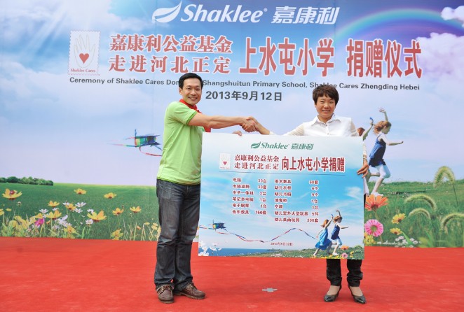 “四年来,公司在政府和社会各界的大力支持下取得了长足的进步。为了回馈社会,履行企业的社会责任,公司设立了嘉康利中国公益基金,在环保、青少年教育、扶贫助残、全民健身、赈灾等方面持续开展公益行动。此次捐助上水屯小学,我们真诚地希望孩子们能够更加健康地成长,有知识、有能力、有梦想、自强不息,成为国家的栋梁之才。”